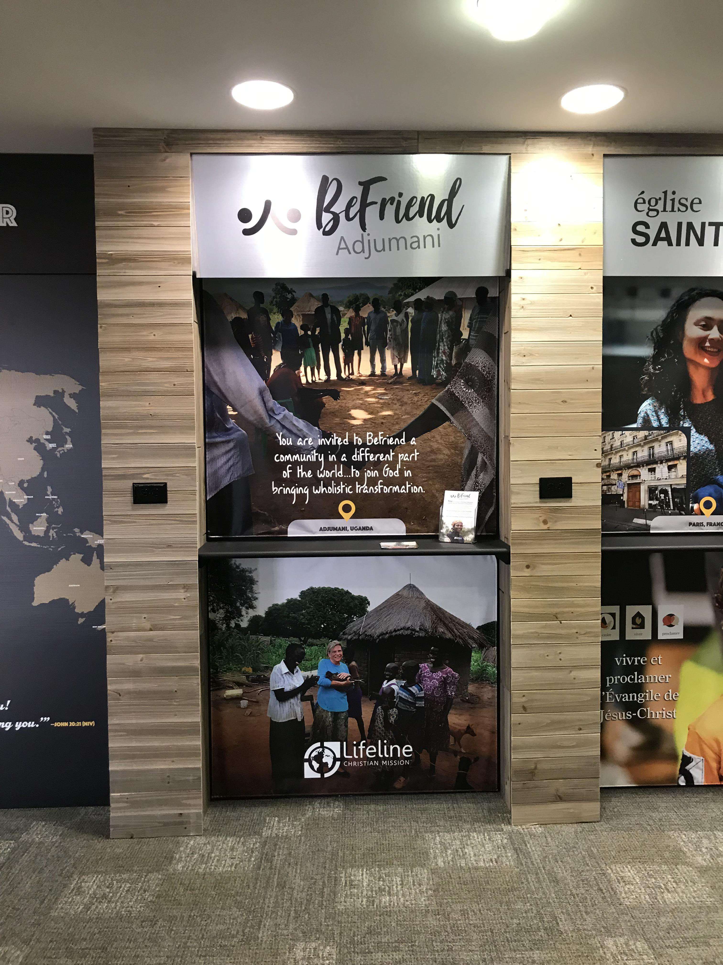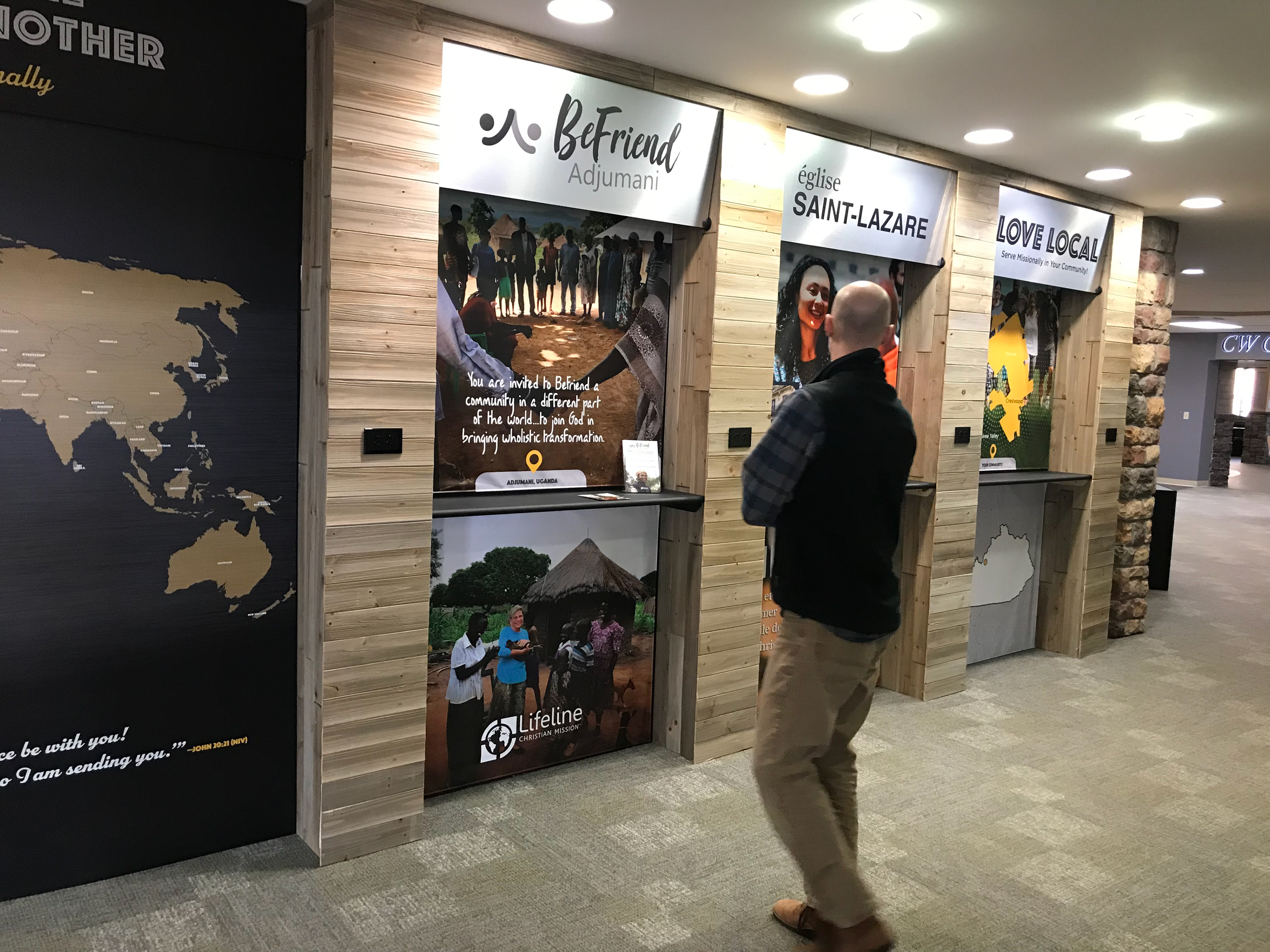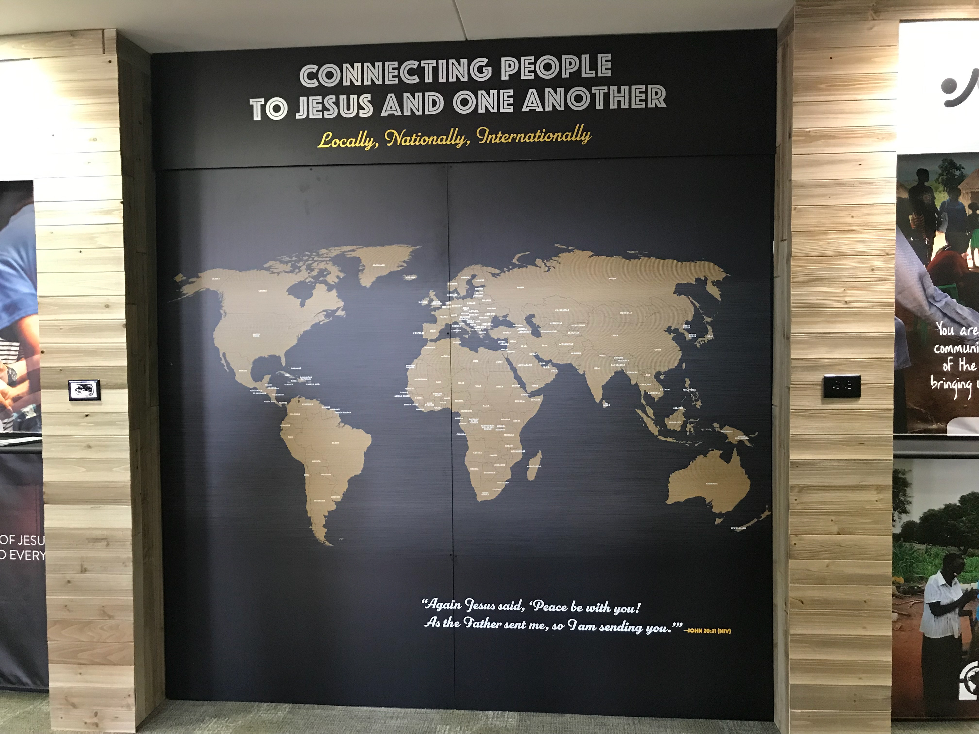 We were approached by Southeast Christian Church to design a permanent "Missions Wall" in the foyer of their Crestwood Campus in Crestwood, KY. From designs (3D renderings) to production of all graphics, sourcing and overseeing installation, we provided comprehensive services to complete this versatile, engaging feature wall (40'). It communicates to visitors and members about the important local and international mission work they help support.