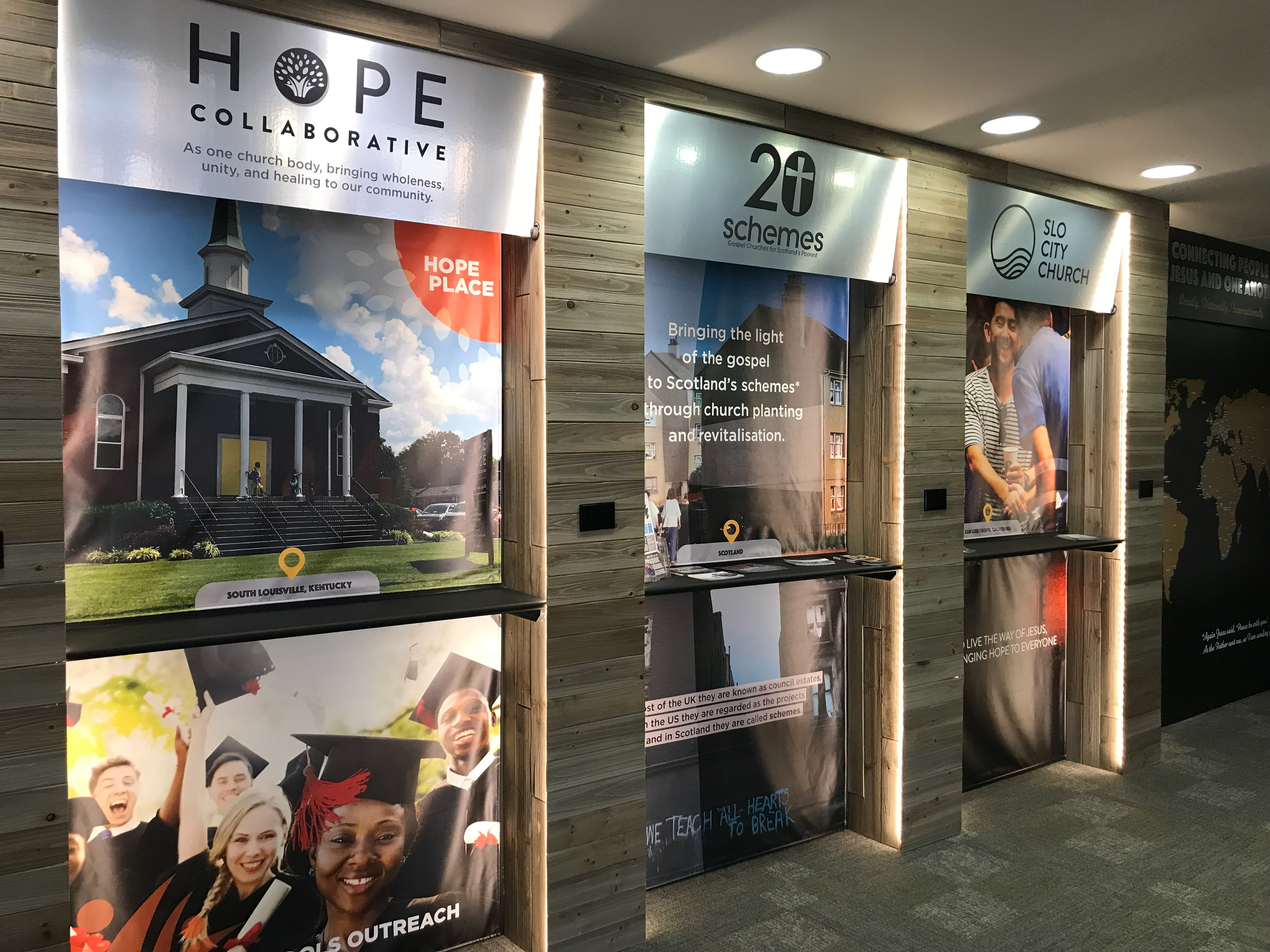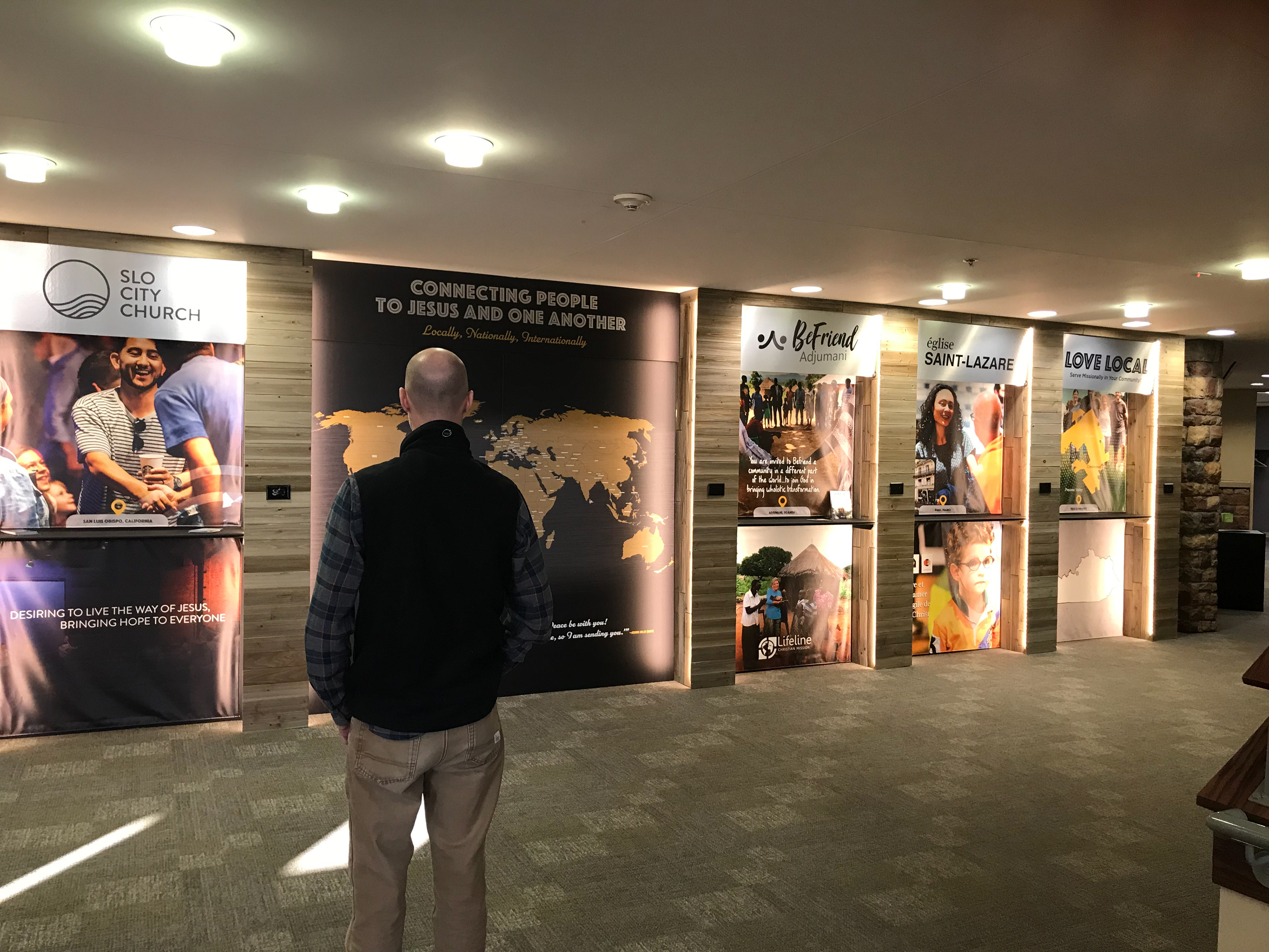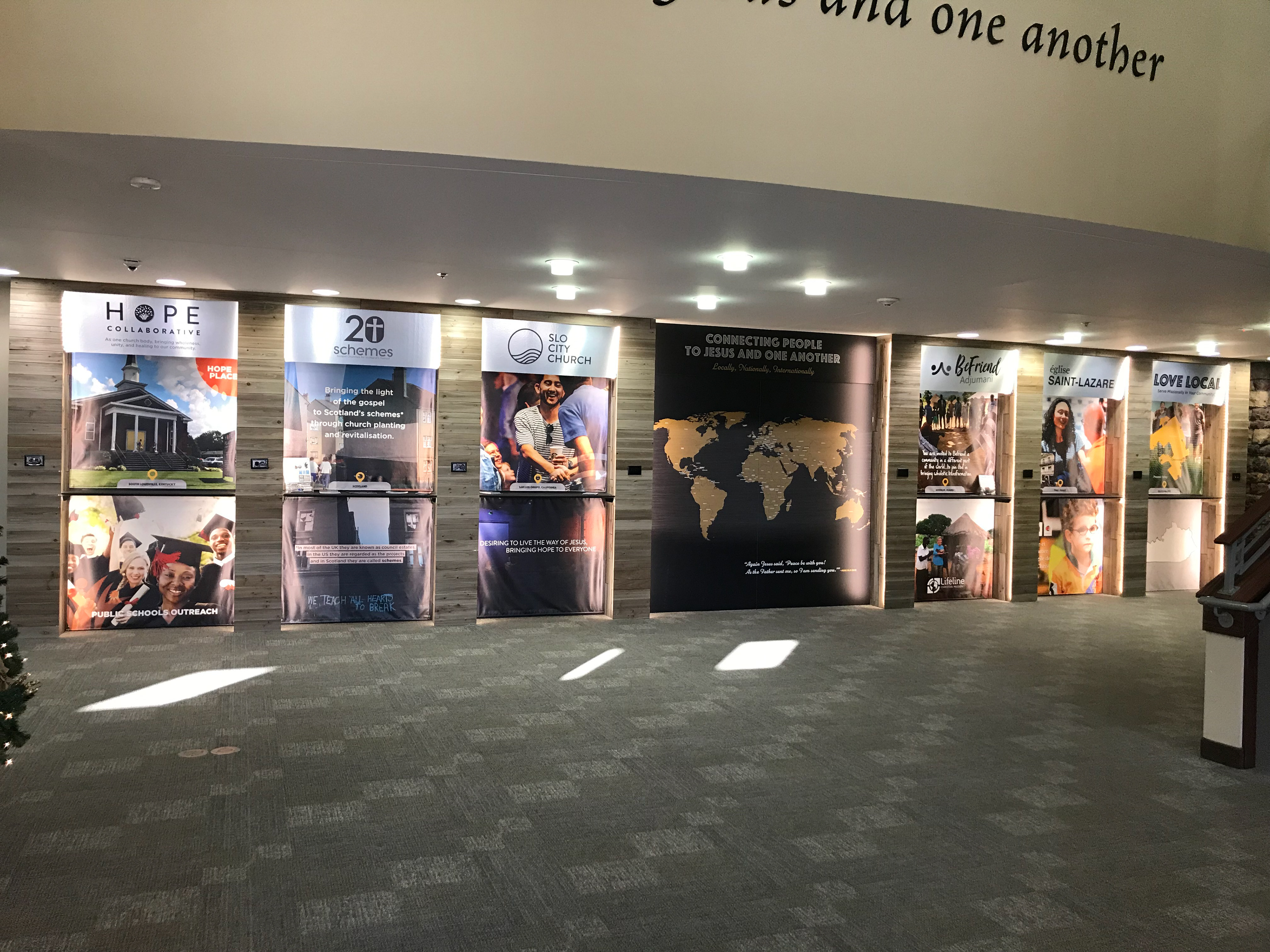We were approached by Southeast Christian Church to design a permanent "Missions Wall" in the foyer of their Crestwood Campus in Crestwood, KY. From designs (3D renderings) to production of all graphics, sourcing and overseeing installation, we provided comprehensive services to complete this versatile, engaging feature wall (40'). It communicates to visitors and members about the important local and international mission work they help support.
